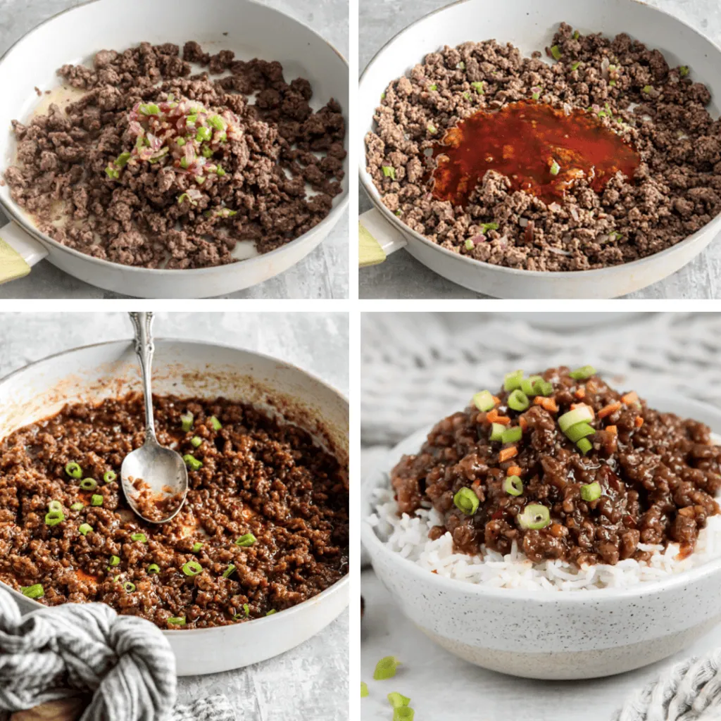 - In a small bowl, add the sweet chili sauce and the rest of the sauce ingredients. Whisk. Pour the mixture over the ground beef and simmer for a couple of minutes. Serve over white or fried rice.