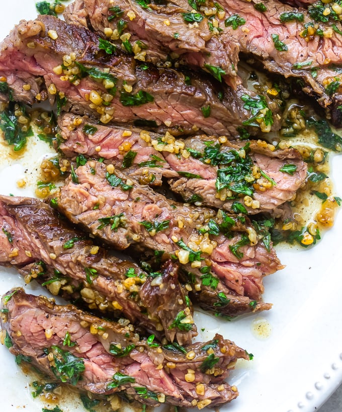 - Pour the garlic butter into a bowl and salt to taste. Slice the steak against the grain. Garnish with parsley and then spoon or pour the garlic butter over the steak. Serve immediately. *See notes.